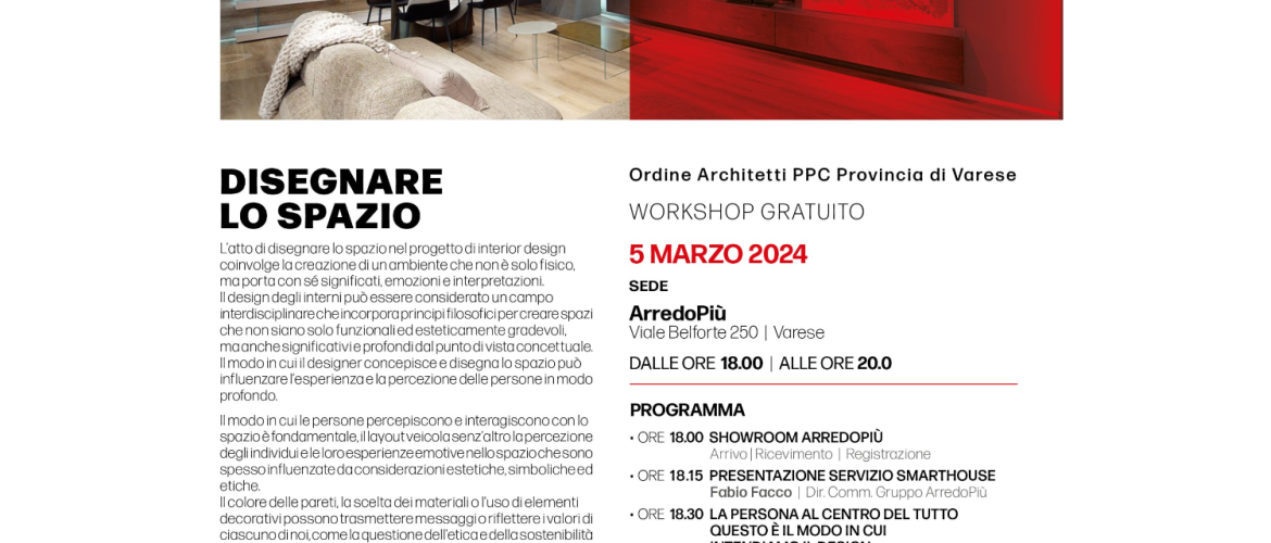 Secondo appuntamento della serie di incontri gratuiti con rilascio di crediti formativi per architetti, organizzati con la collaborazione di Ordine Architetti di Varese: Martedì 5 Marzo 2024 alle 18.00, in Arena, all’interno dello showroom, vi aspettiamo con Lago e Flos per un workshop sul tema “Disegnare lo spazio”, offrendo uno spunto per parlare di interior design come campo interdisciplinare che incorpora principi filosofici per creare spazi che non siano solo funzionali ed esteticamente gradevoli, ma anche significativi e profondi dal punto di vista concettuale.