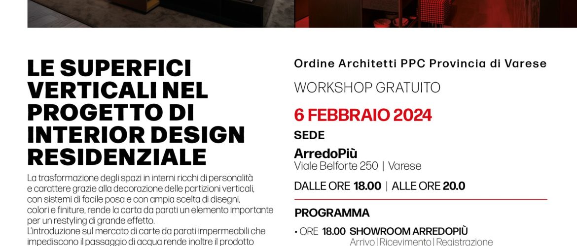 Abbiamo il piacere di segnalare che con il mese di Febbraio 2024 daremo il via a una serie di incontri gratuiti con rilascio di crediti formativi per architetti, organizzati con la collaborazione dell’Ordine degli Architetti di Varese: si tratta di workshop gratuiti a cui parteciperanno aziende e professionisti del mondo dell’arredamento che costituiranno occasione di scambio e confronto su varie tematiche che riguardano il settore dell’interior design.