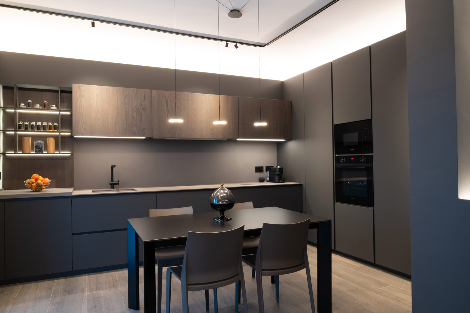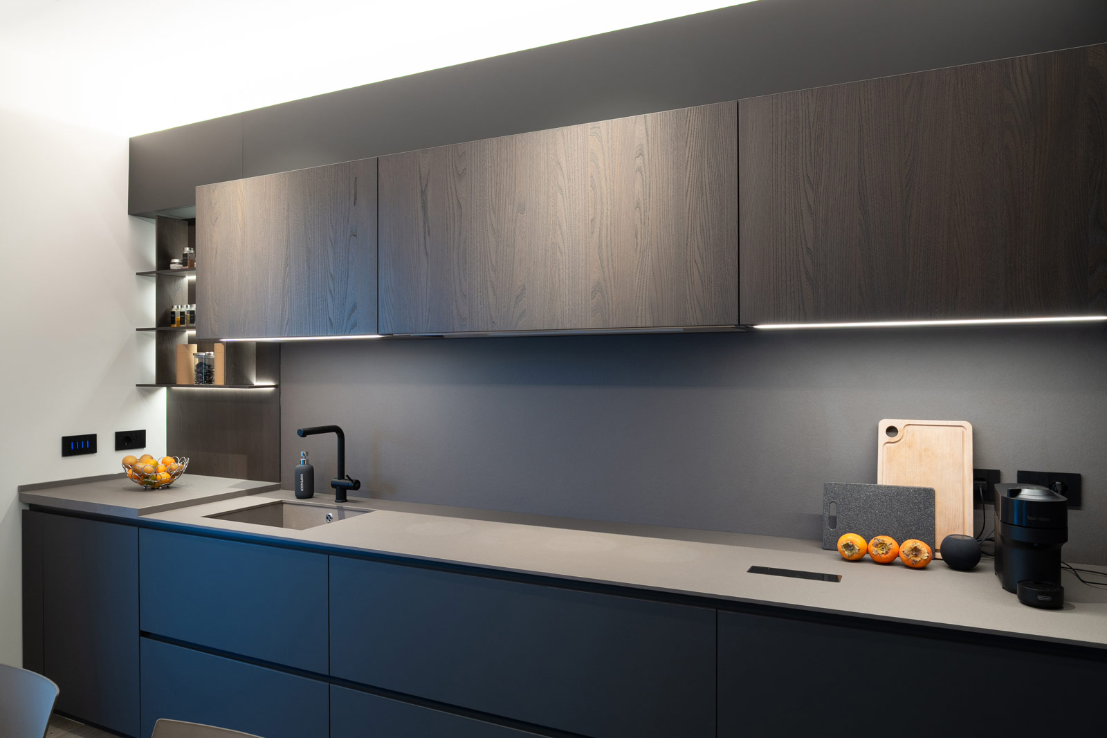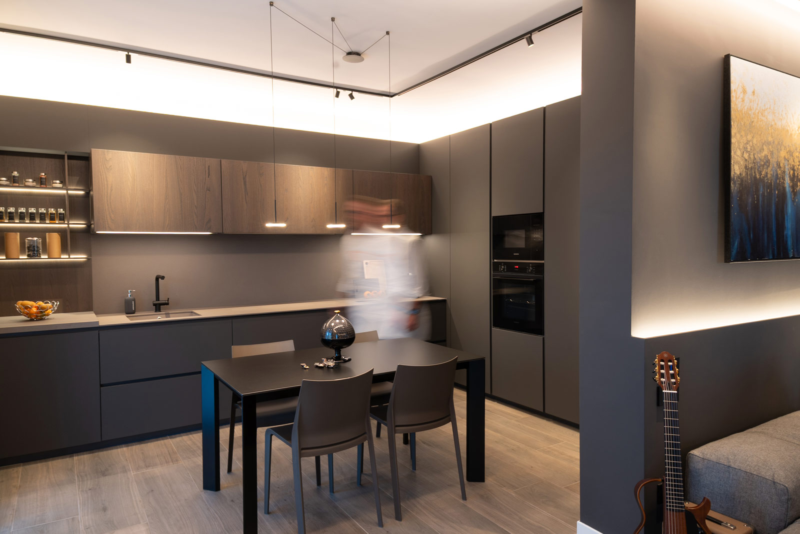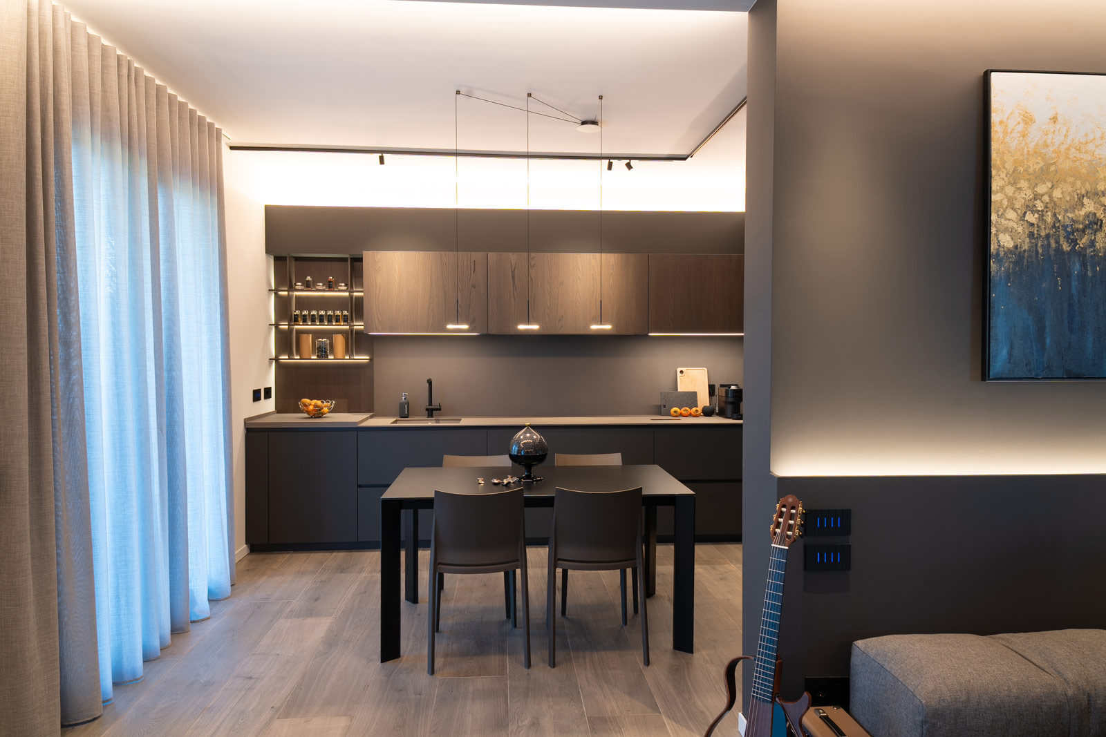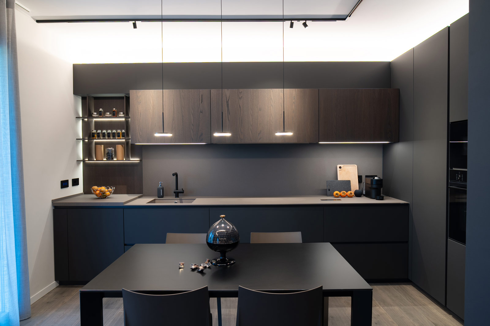 La cucina, interamente fornita e progettata da noi, rappresenta il cuore funzionale della casa. Linee essenziali, finiture materiche e tonalità profonde si uniscono a soluzioni illuminotecniche integrate, pensate per garantire praticità, ordine e un’estetica raffinata, adatta a un utilizzo quotidiano ma sempre elegante.