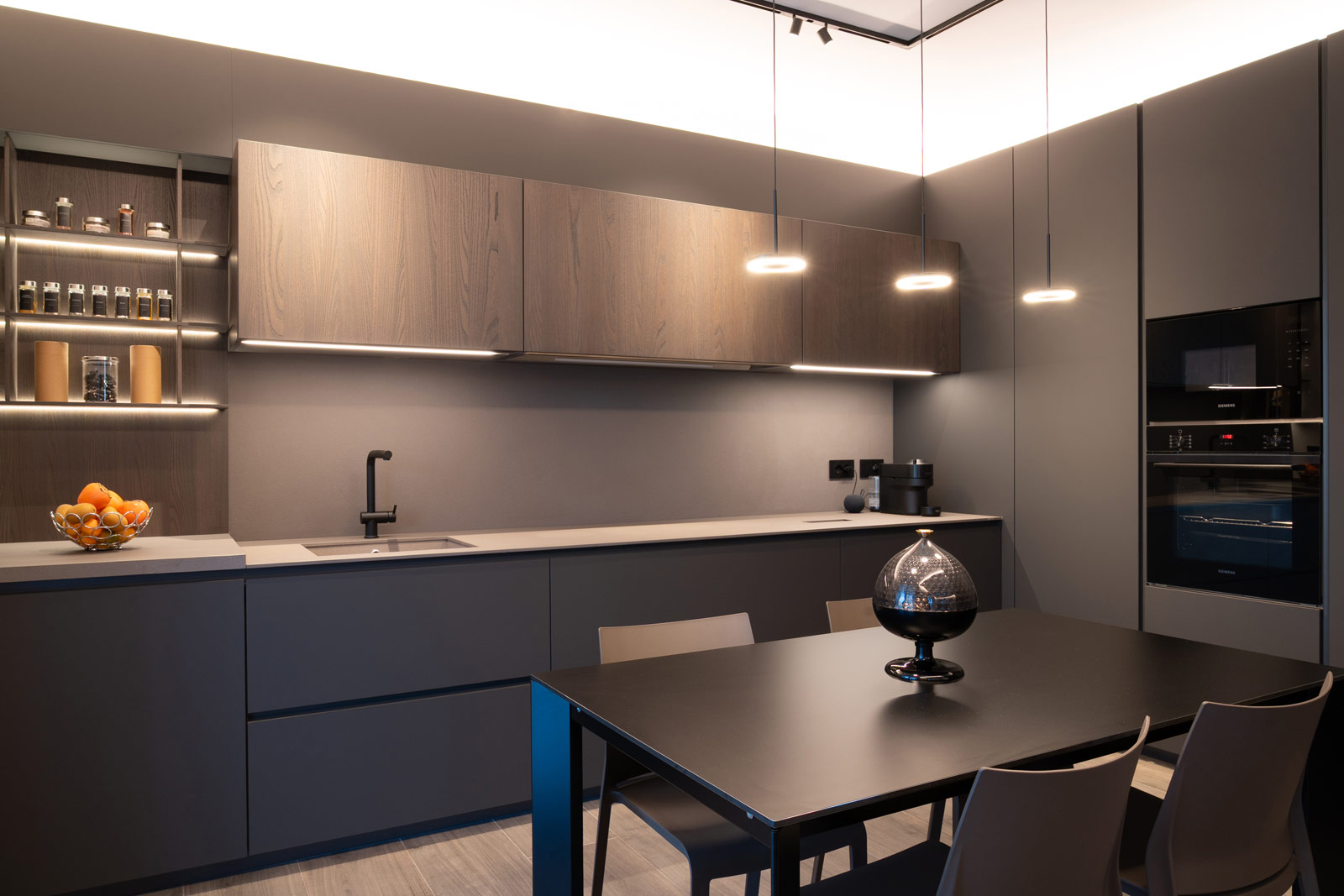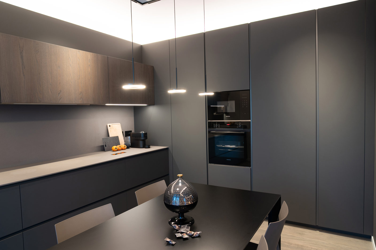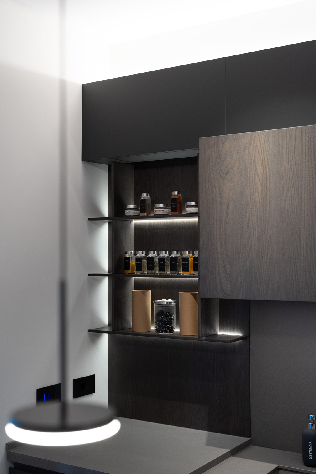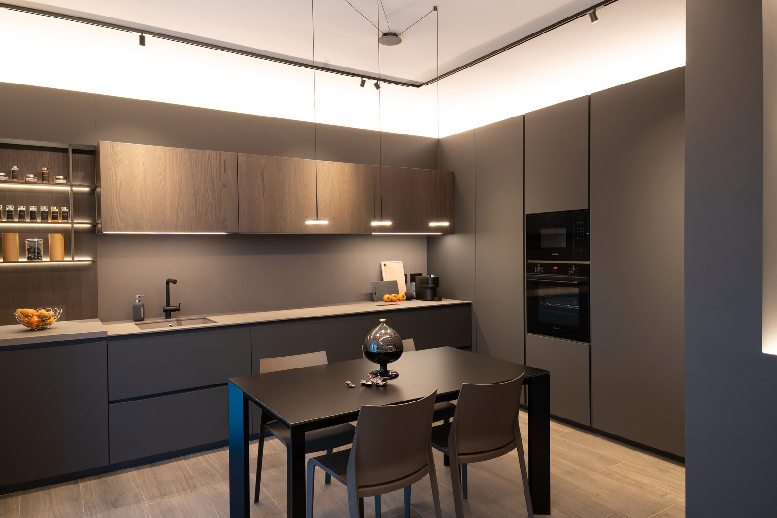 La cucina, interamente fornita e progettata da noi, rappresenta il cuore funzionale della casa. Linee essenziali, finiture materiche e tonalità profonde si uniscono a soluzioni illuminotecniche integrate, pensate per garantire praticità, ordine e un’estetica raffinata, adatta a un utilizzo quotidiano ma sempre elegante.