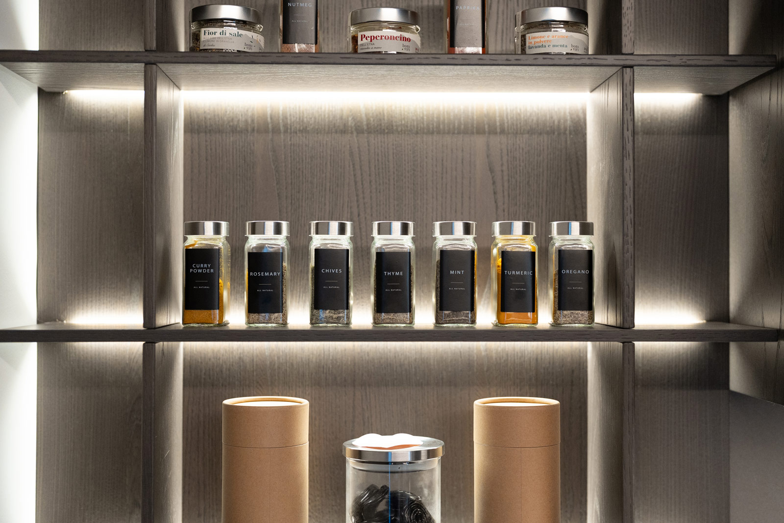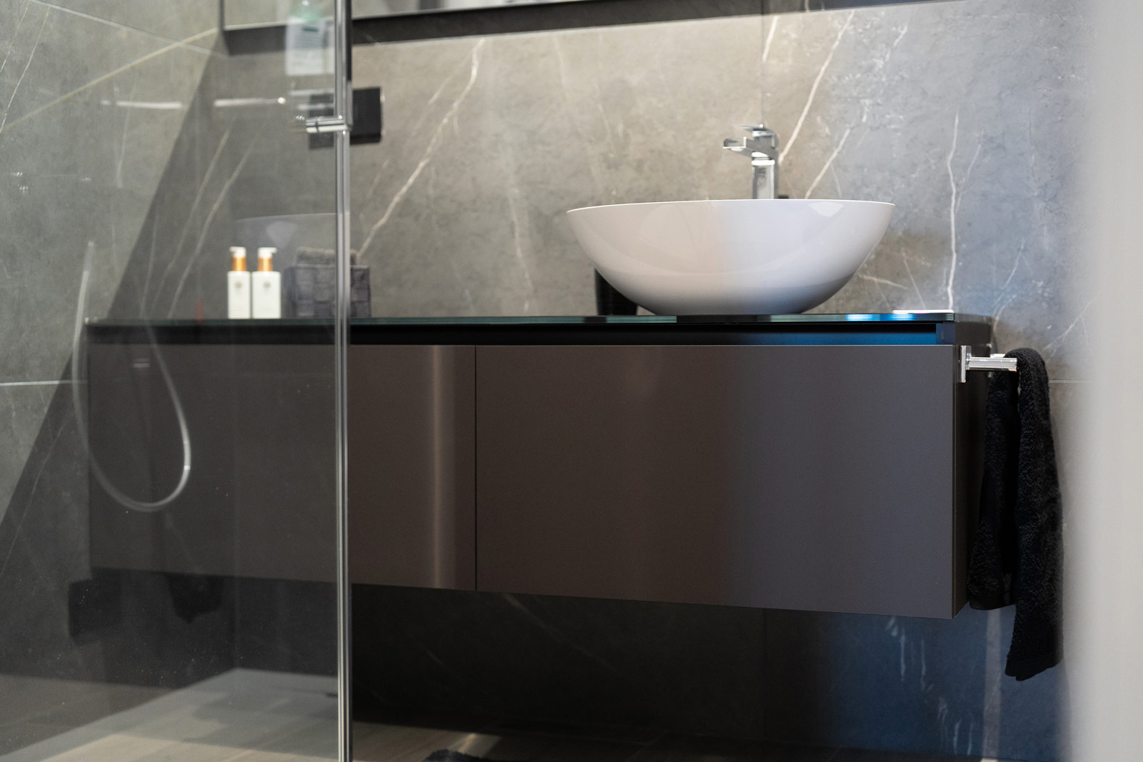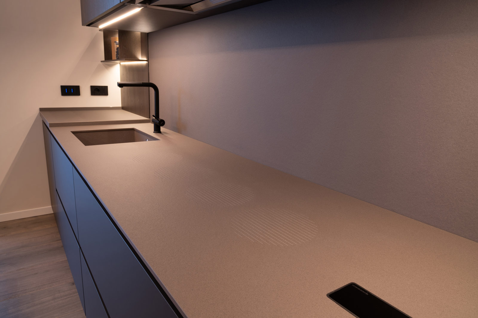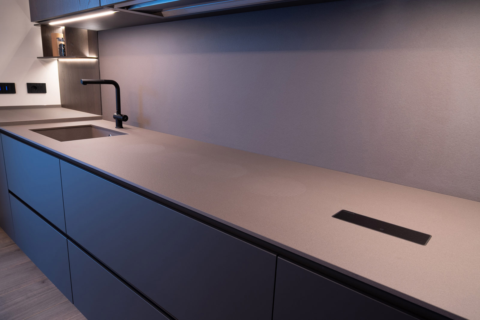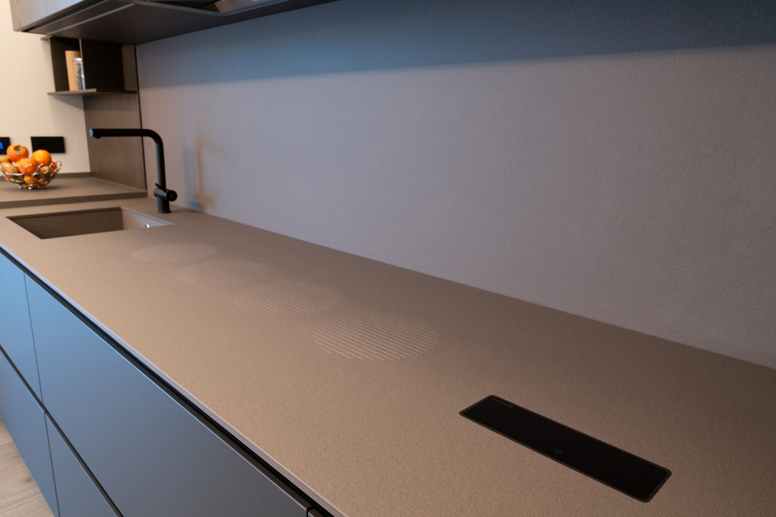 La cucina, interamente fornita e progettata da noi, rappresenta il cuore funzionale della casa. Linee essenziali, finiture materiche e tonalità profonde si uniscono a soluzioni illuminotecniche integrate, pensate per garantire praticità, ordine e un’estetica raffinata, adatta a un utilizzo quotidiano ma sempre elegante.