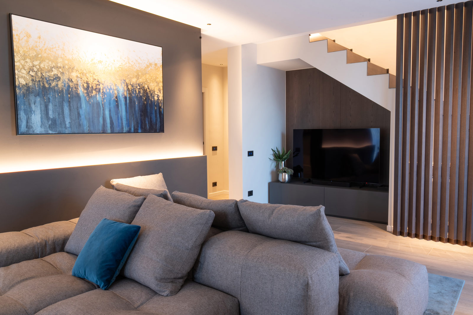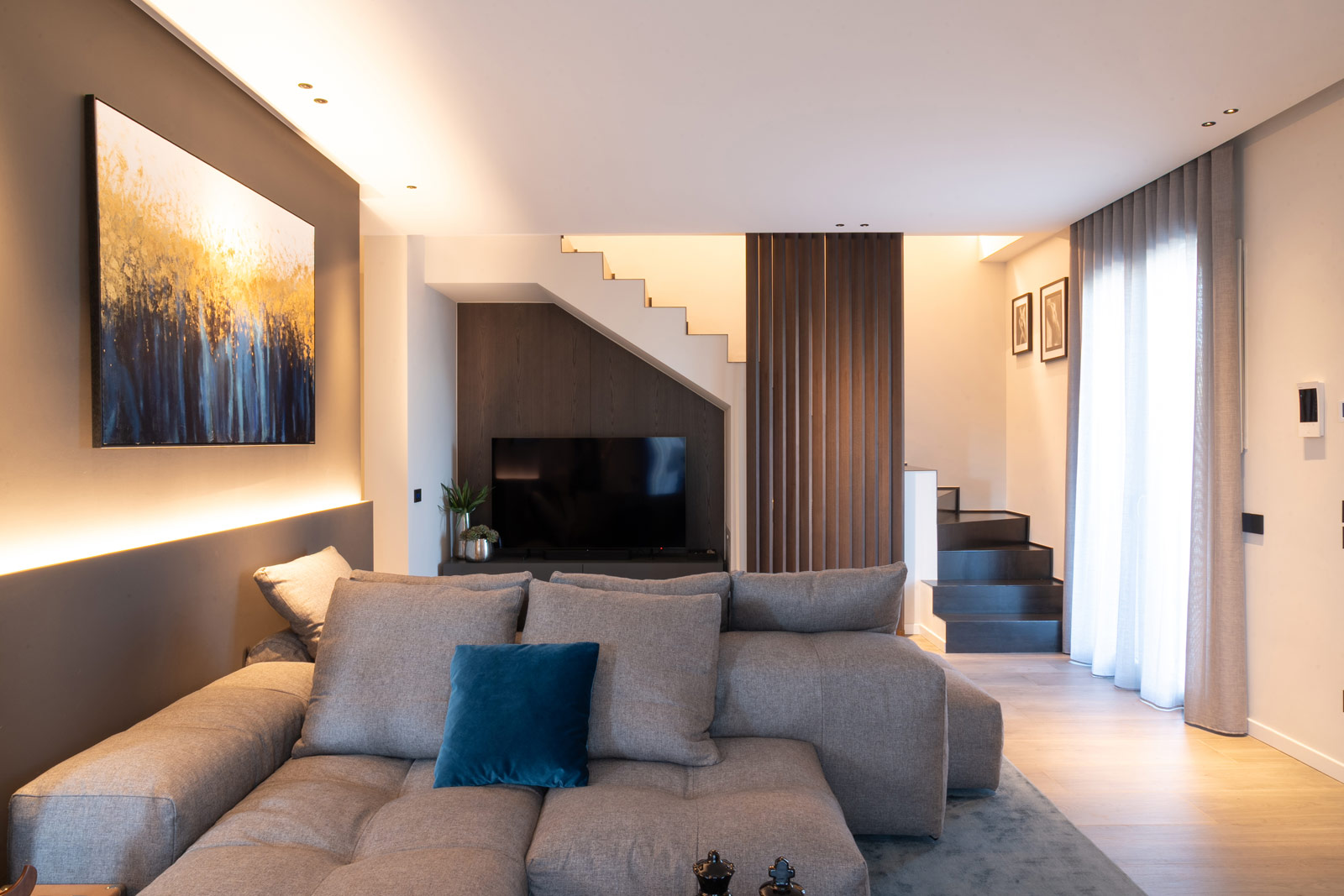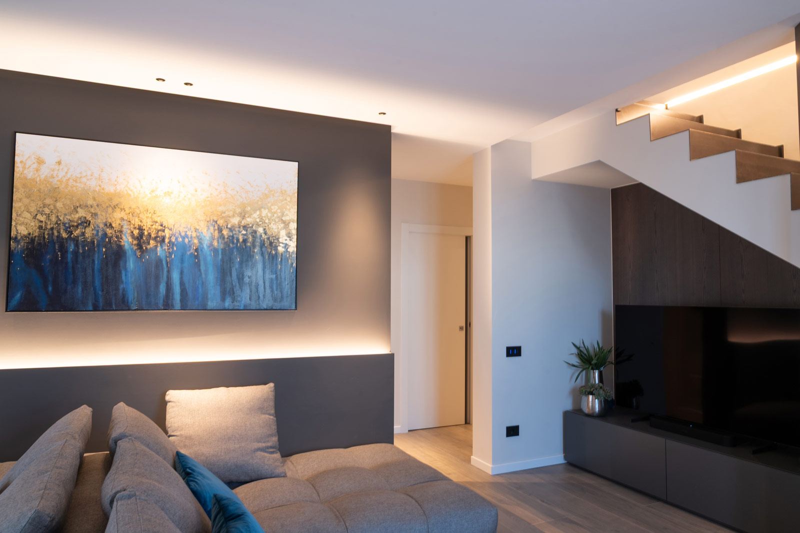 Al piano terra, soggiorno, cucina e bagno sono pensati come un unico sistema fluido, dove volumi, materiali e luce dialogano in modo armonico. La zona living è concepita come uno spazio accogliente e contemporaneo, definito da arredi dalle forme pulite e da elementi su misura che scandiscono l’ambiente senza appesantirlo. L’illuminazione, progettata con grande attenzione, accompagna i volumi architettonici e valorizza le superfici, contribuendo a creare un’atmosfera calda e rilassante.