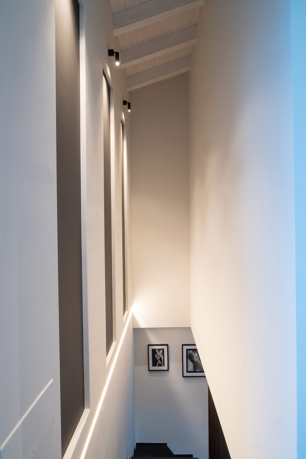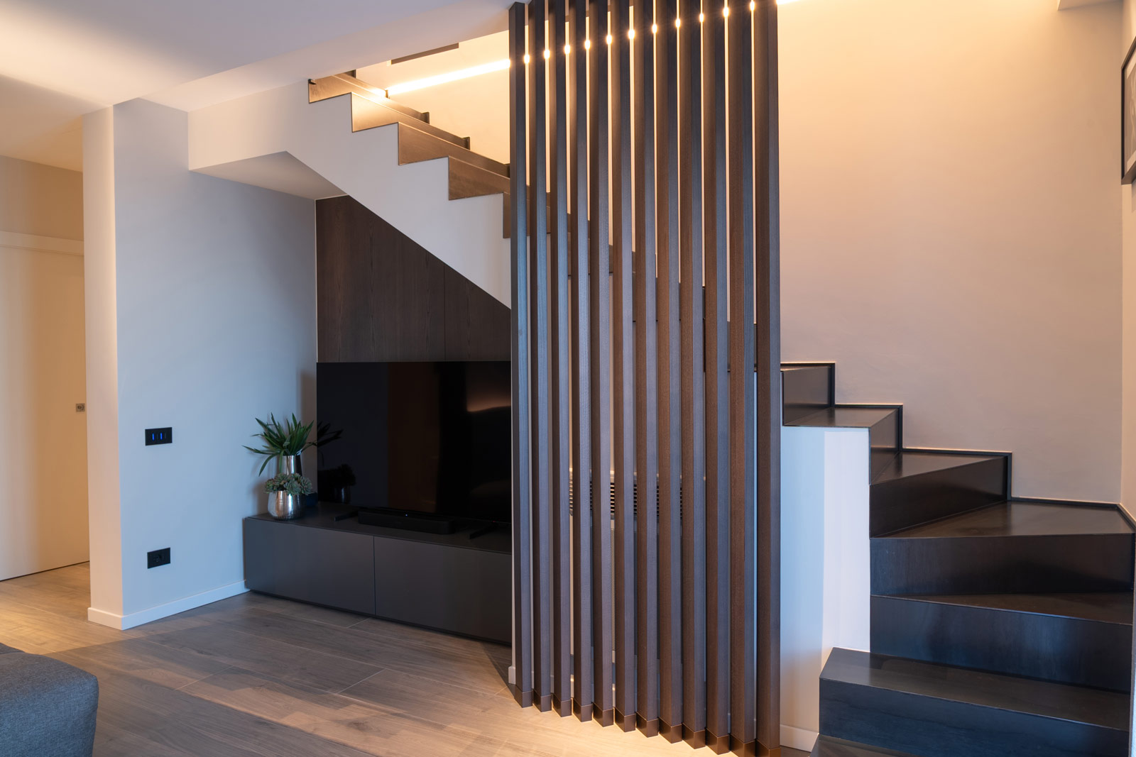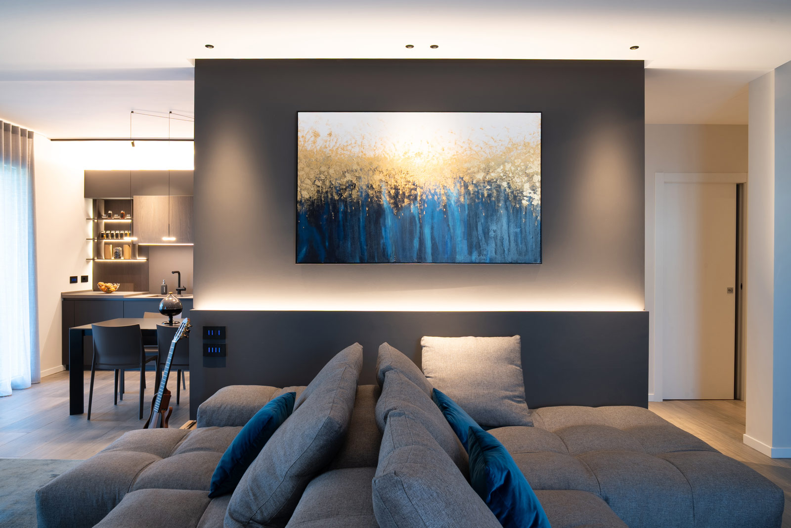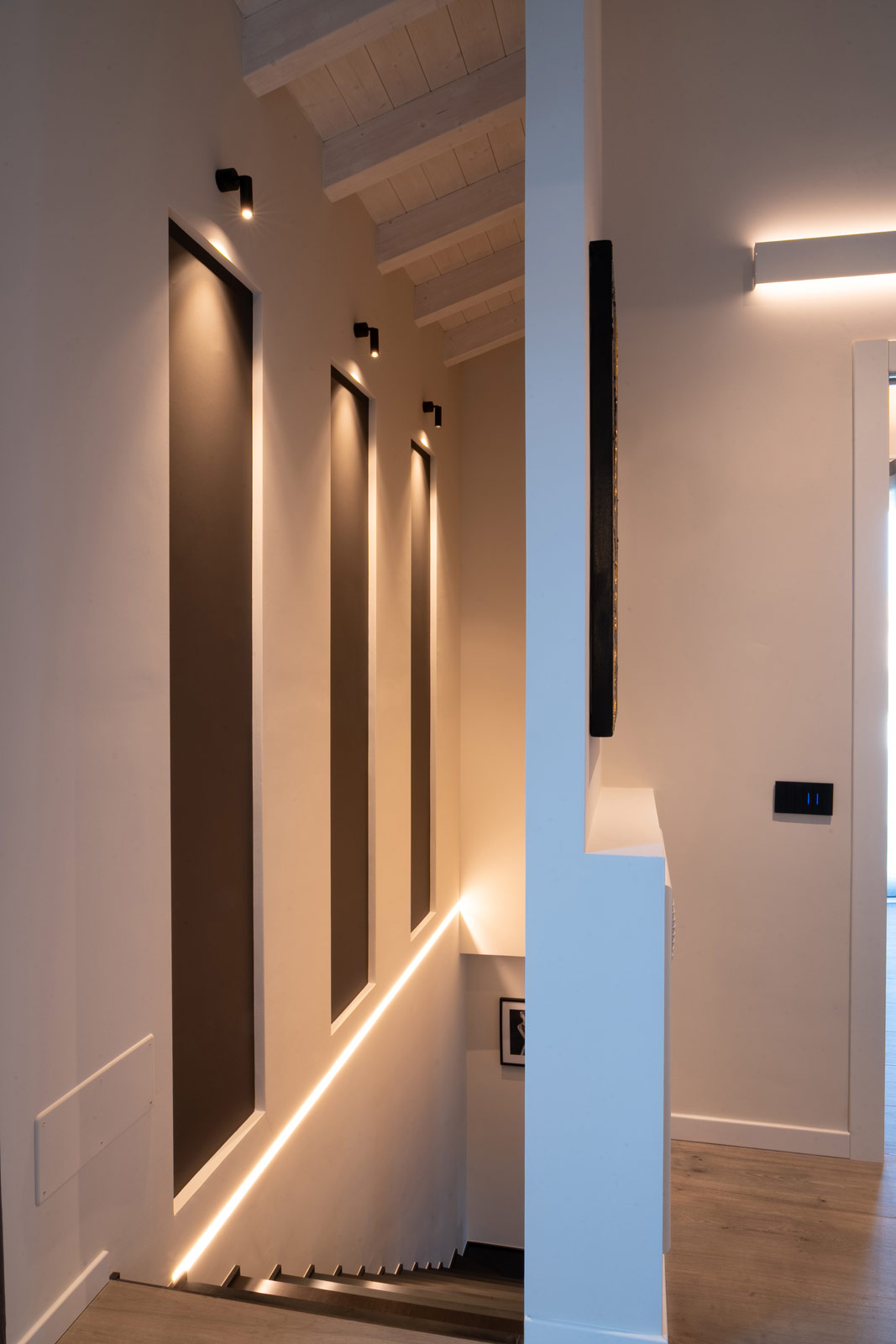 Al piano terra, soggiorno, cucina e bagno sono pensati come un unico sistema fluido, dove volumi, materiali e luce dialogano in modo armonico. La zona living è concepita come uno spazio accogliente e contemporaneo, definito da arredi dalle forme pulite e da elementi su misura che scandiscono l’ambiente senza appesantirlo. L’illuminazione, progettata con grande attenzione, accompagna i volumi architettonici e valorizza le superfici, contribuendo a creare un’atmosfera calda e rilassante.