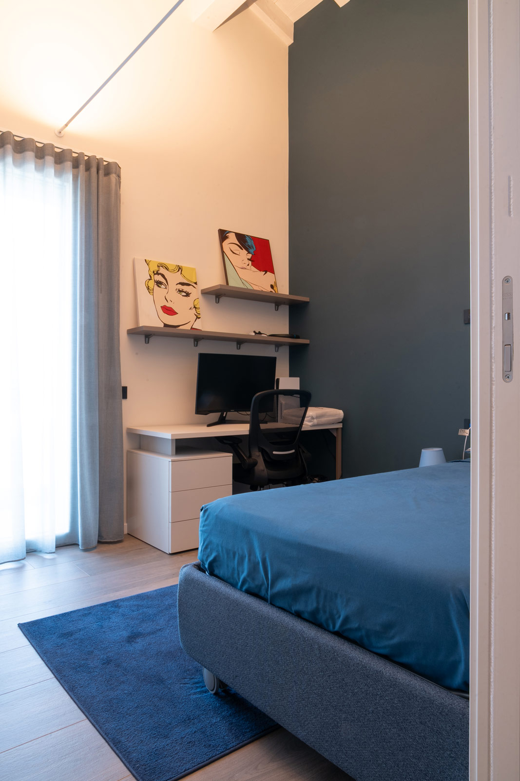 Le due camere singole rispondono a esigenze diverse, mantenendo però una forte coerenza stilistica. Lo studio è uno spazio funzionale e ordinato, pensato per il lavoro e la concentrazione, con arredi su misura e una luce studiata per accompagnare le attività quotidiane. La cameretta della figlia di Stefano, invece, è un ambiente delicato e luminoso, declinato in tonalità di rosa che esprimono personalità e dolcezza, senza rinunciare a equilibrio e funzionalità.
