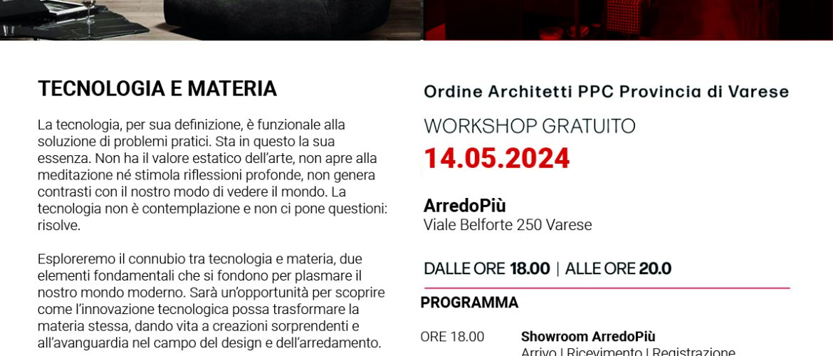 Tecnologia e Materia – Workshop Gratuito Martedì 14 Maggio 2024 h. 18